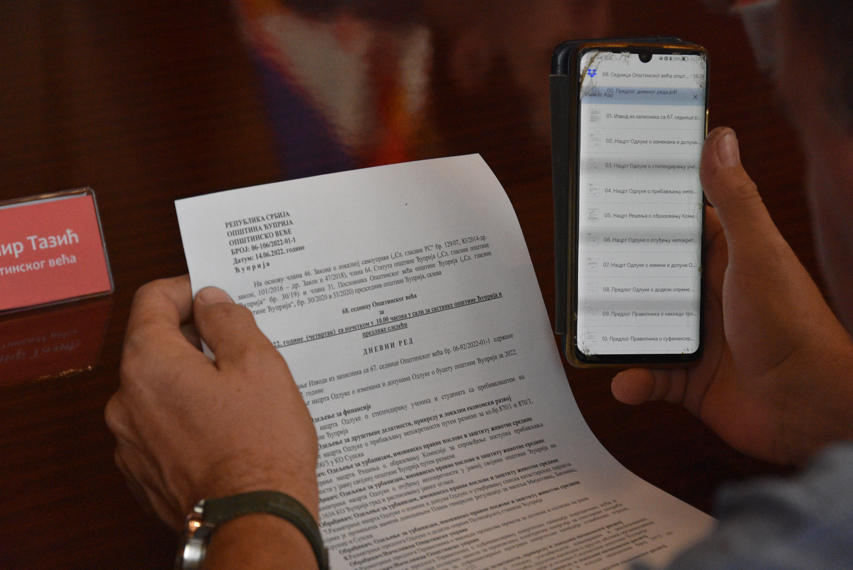 Обиман дневни ред (укупно 24 тачке) обележио је 68. седницу општинске владе. Седницу је отворио предлог ребаланса буџета, условљен, како је предлагач образложио, средствима које је општина добила од Министарства омладине и спорта и Министарства културе, али и одустајањем од кредита за одржавање текуће ликвидности, јер је финансирање општине редовно. Због отказивања задуживања, укупан износ буџета смањен је за oко 18,8 милиона динара.
