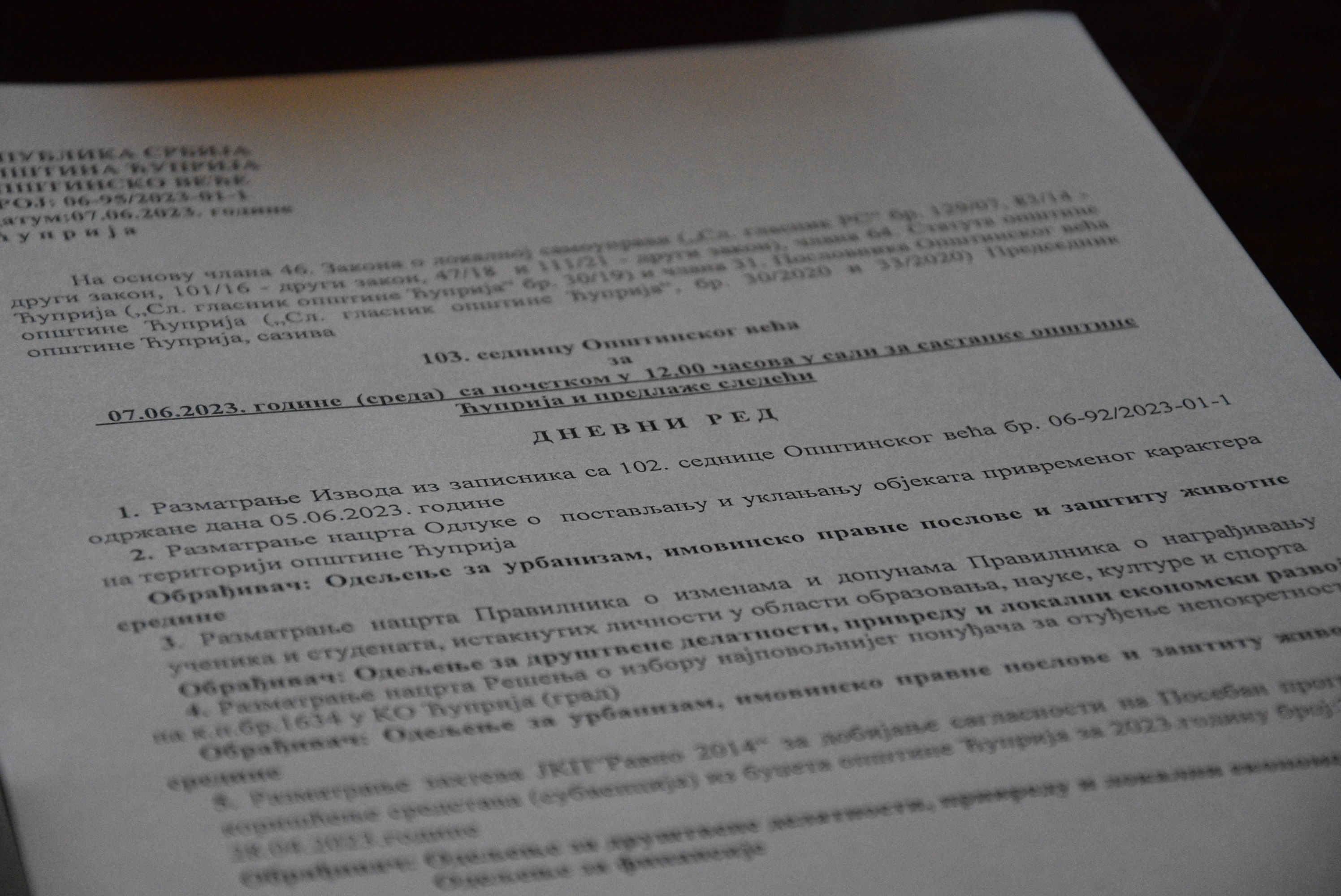 Овоме додајмо да је Општинско веће Правобранилаштву дало сагласност да закључи споразум о међусобном регулисању односа са фирмом Телеком Србија АД, да су већници донели решење о формирању Организационог одбора за обављање послова у вези са организовањем и обележавањем Дана општине Ћуприја, као и да су потврђени закључци Комисије за утврђивање основаности захтева и висине накнаде штете настале услед уједа паса и мачака луталица и напада паса луталица на домаће животиње.